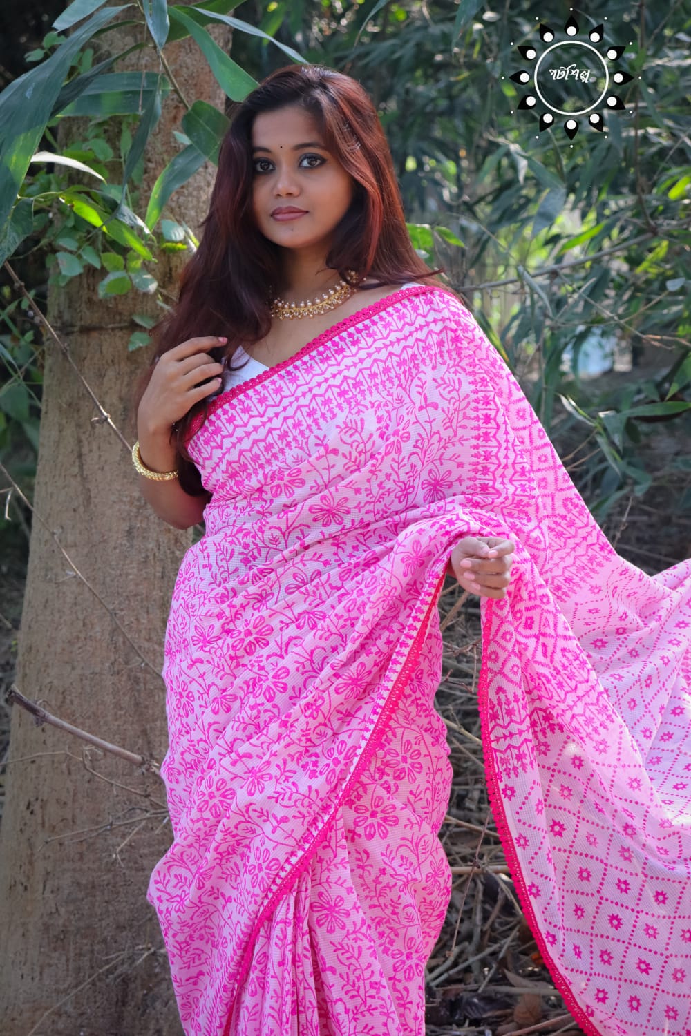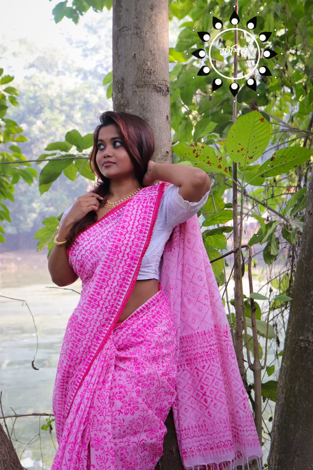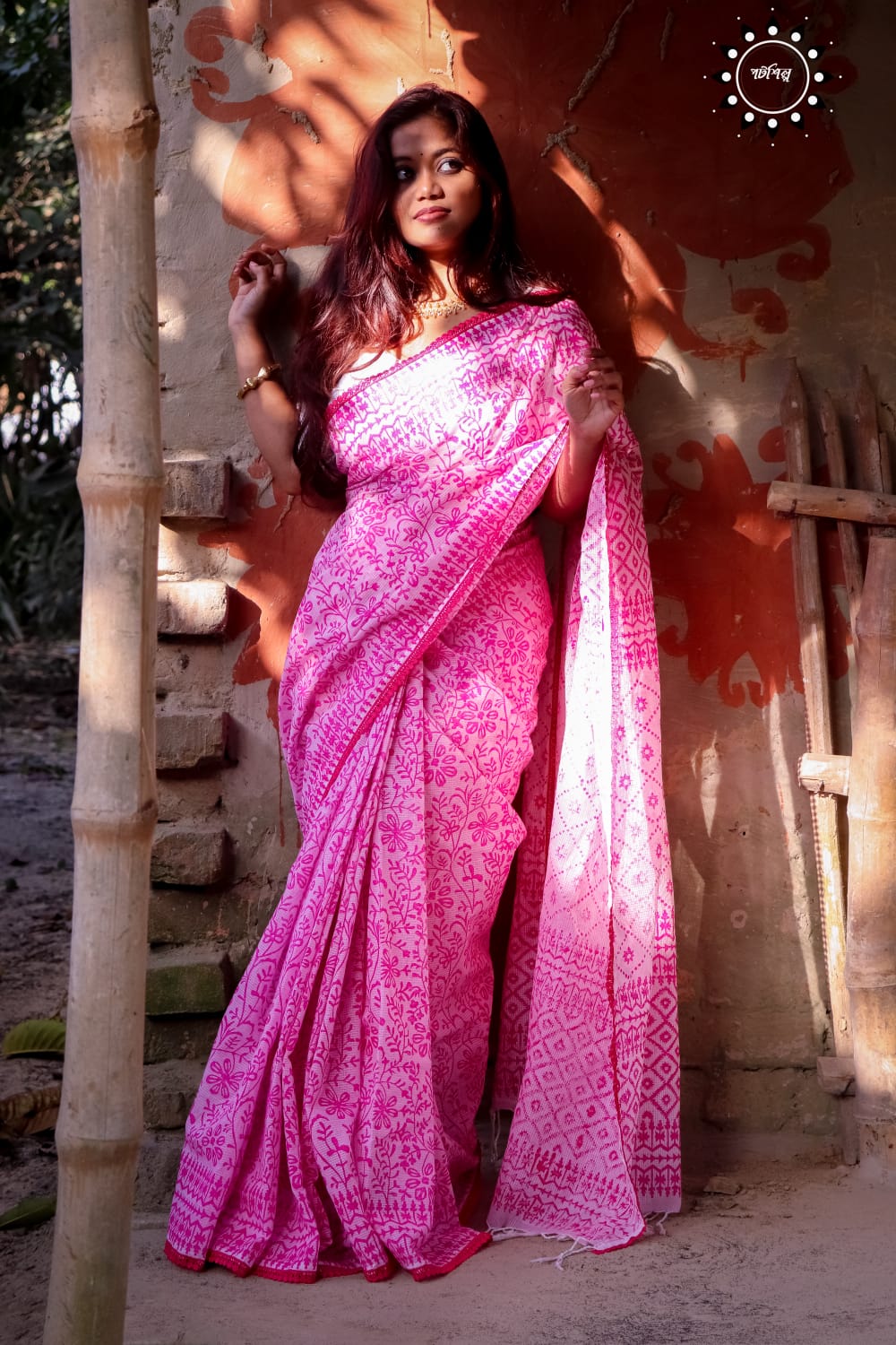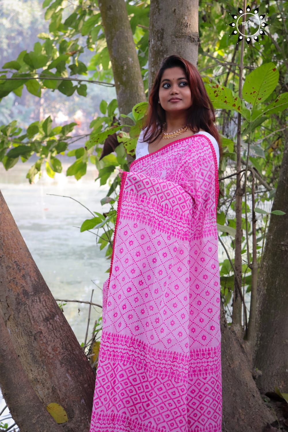 ১৩.৫ হাত কোটা সুতি শাড়িজুড়ে কাঠব্লকের জলছাপ দেয়া ও পুরো শাড়িজুড়ে লেইসের পাড় লাগানো রয়েছে।