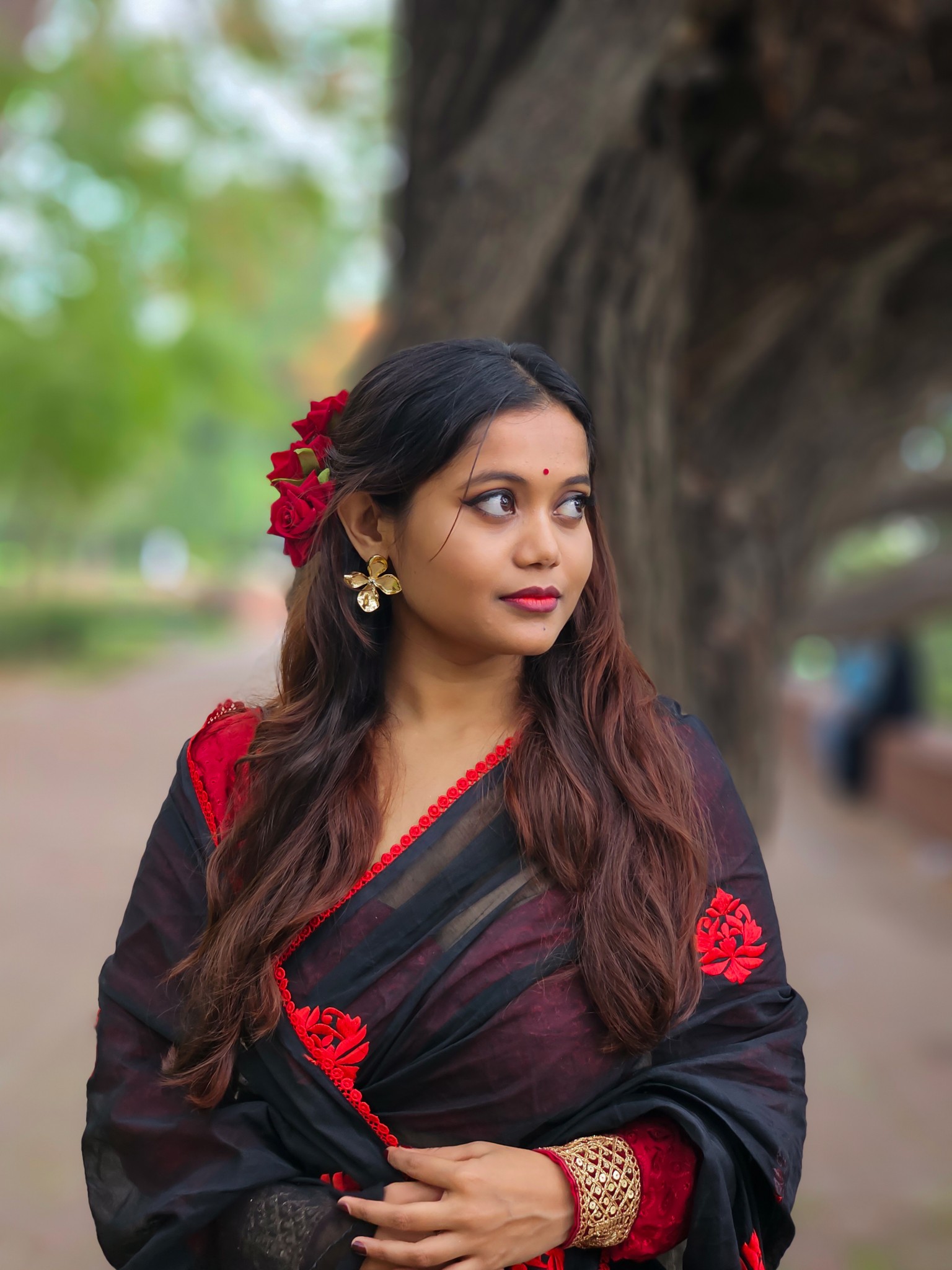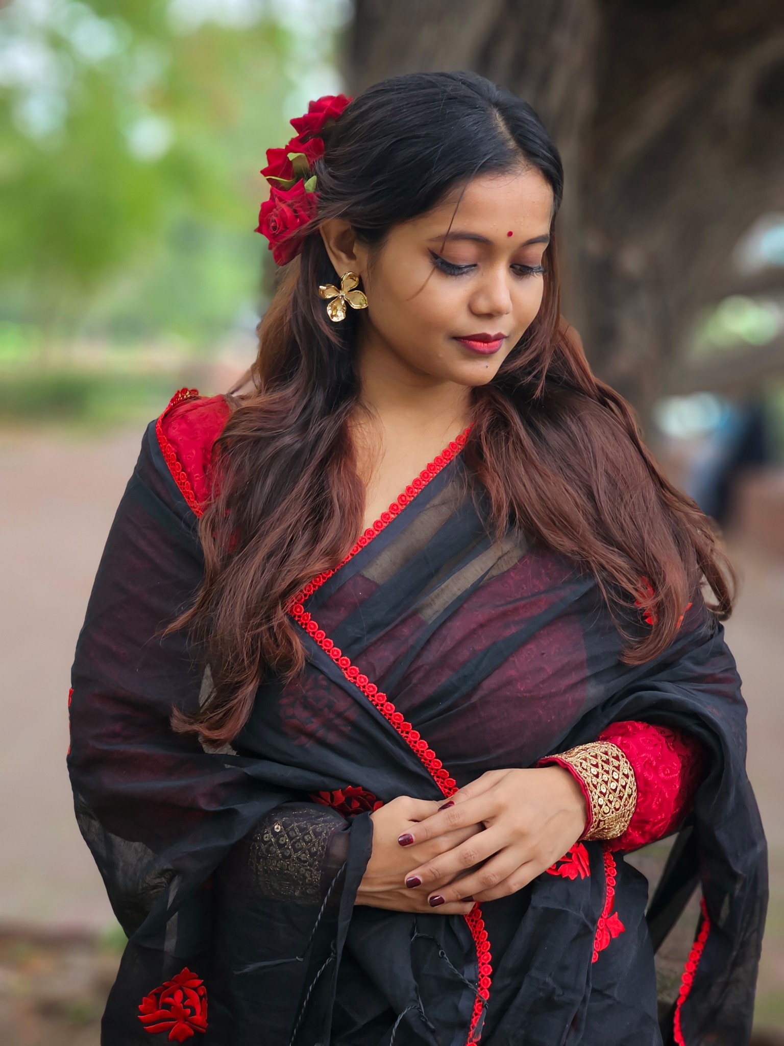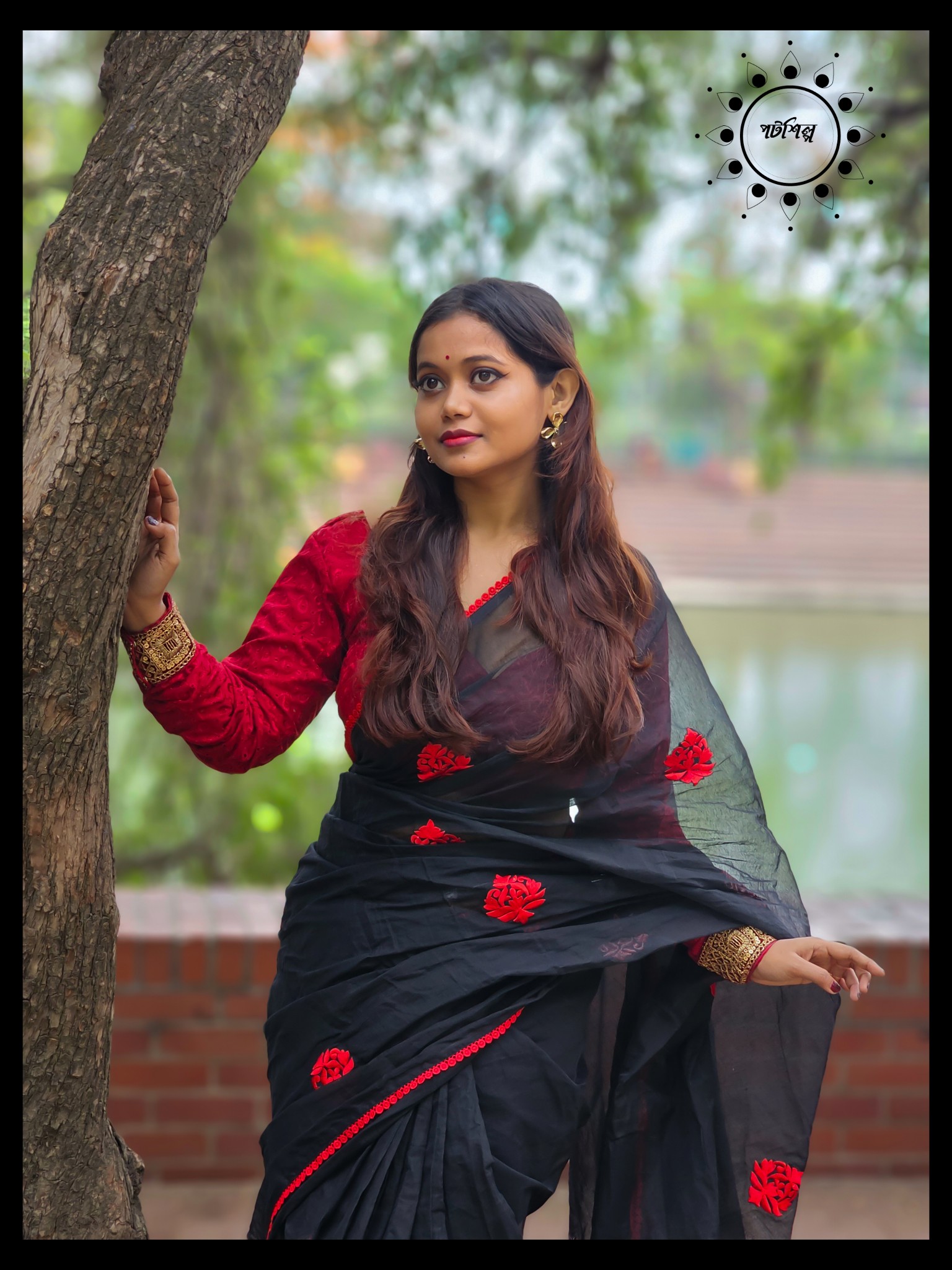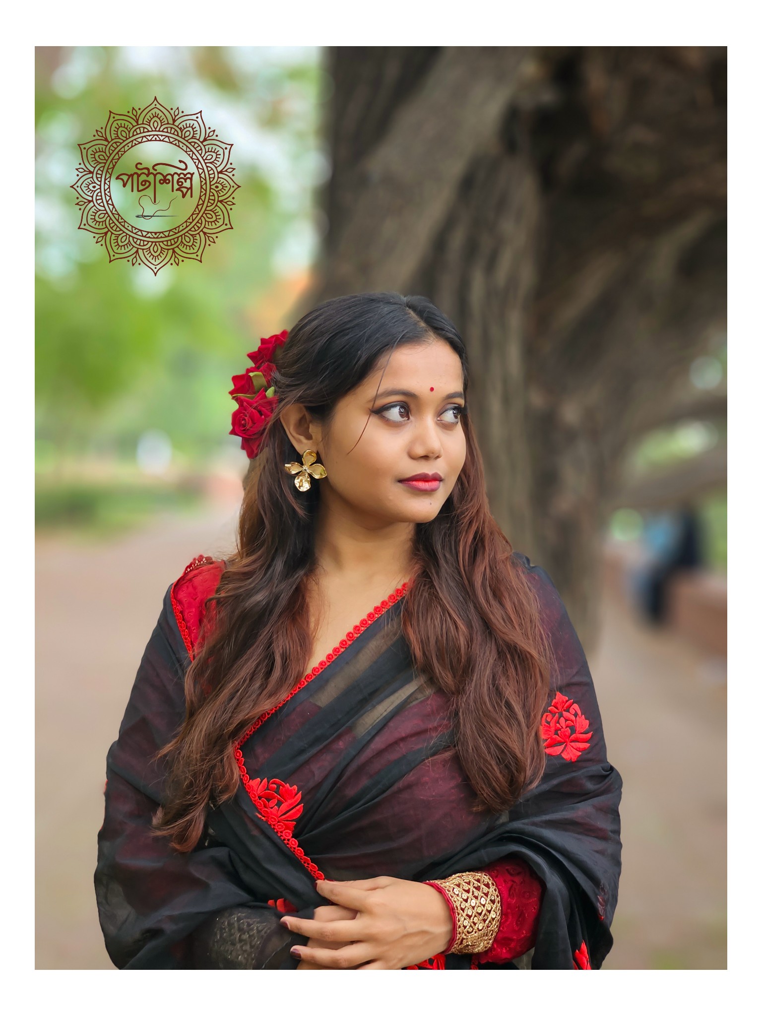 শাড়ি বিবরণঃ ১৩ হাত সেমি মসলিন পুরো শাড়িজুড়ে মেশিন এমব্রয়ডারি ও লেইস বসানো হয়েছে।