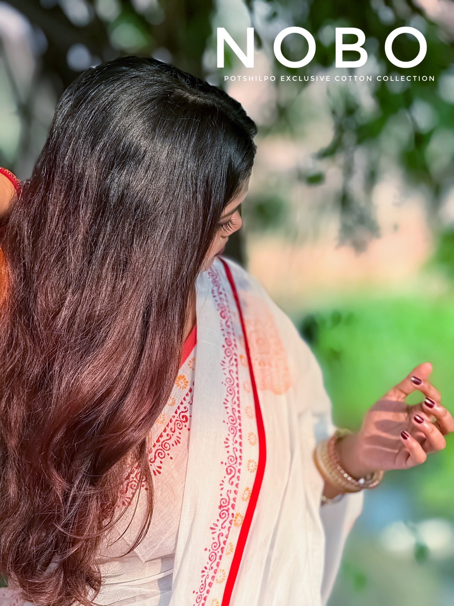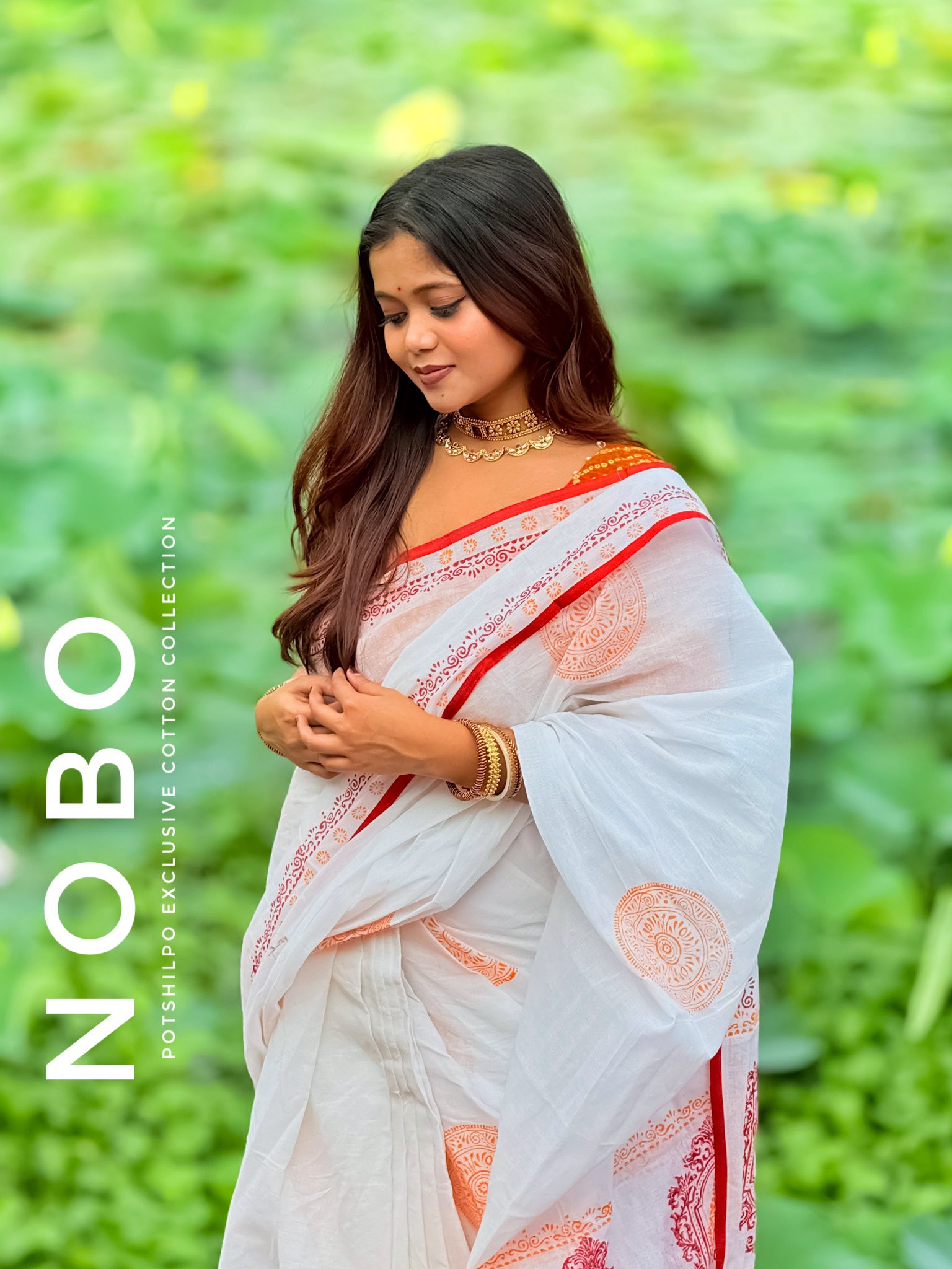 বিররণঃ শুভ্র সাদা রঙের ১৪ হাত (৬.৬৭গজ) আড়ং কটন শাড়িতে কাঠব্লকের জলছাপ (১৪ হাত শাড়ির ২ হাত রানিং ব্লাউজ পিস, শাড়ি থেকে কেটে নিতে হবে, শাড়ির ব্লকেই ডিজাইন টা করা )